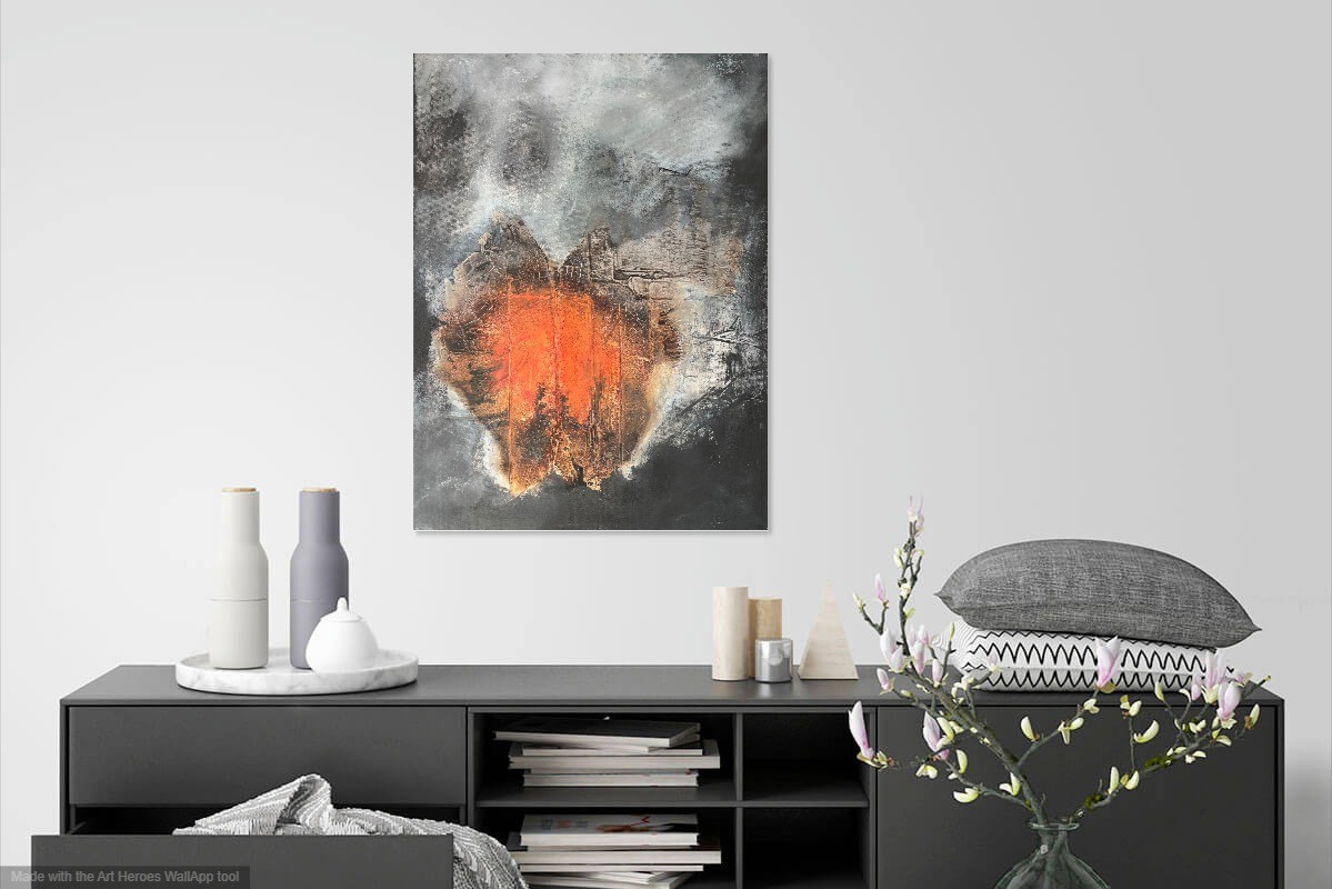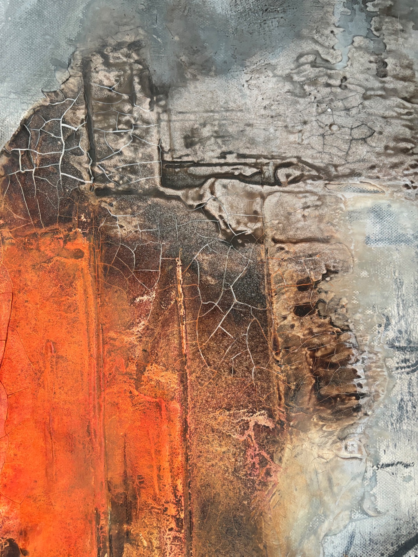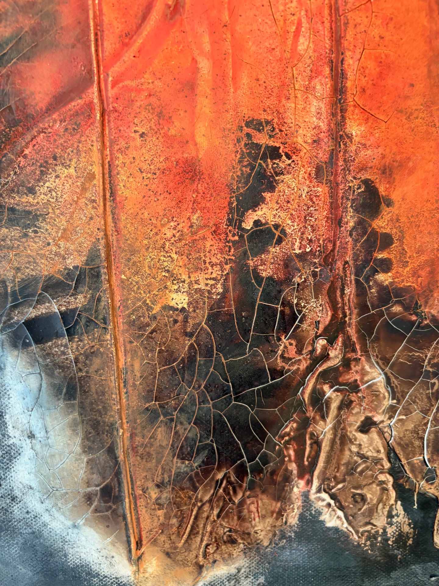 Størrelse 60X80 med 2 cm svart kant. Krakeleringer med kaldvoks.